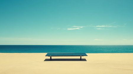 A serene beach scene featuring a modern bench positioned on golden sand, with a vast ocean and clear blue sky in the background, inviting relaxation.