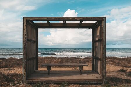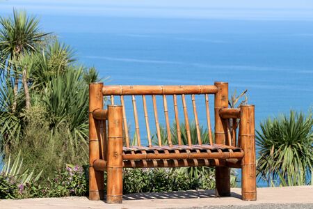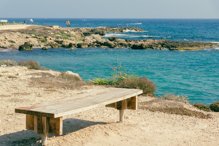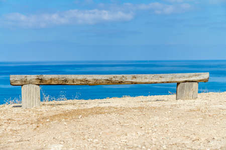 Close-up shot of a wooden bench standing on a mountain at the beach of azure mediterranean sea and surrounded by a beautiful nature of Cyprus.