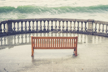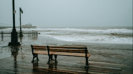 A solitary wooden bench sits on a wet boardwalk, surrounded by stormy waves and a gray sky, evoking a sense of solitude and contemplation by the ocean.