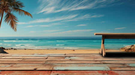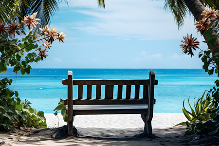 Wooden bench with flowers in the middle of two palm trees on the shore of a blue sea, generative ai