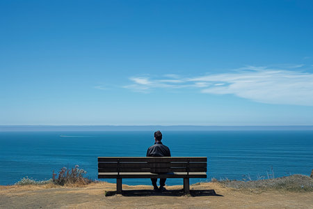 A man sitting on a bench, looking out at the ocean on a sunny day