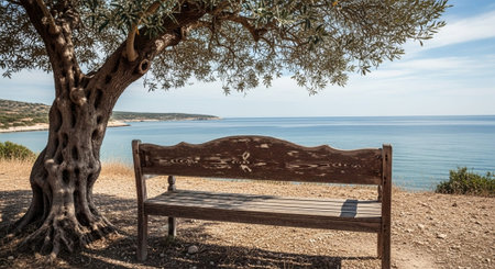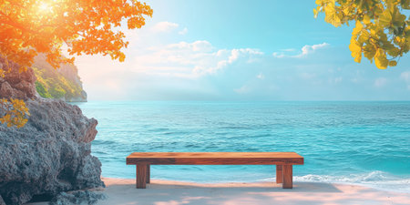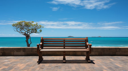 Serene Coastal View at Tranquil Beach with Vacant Wooden Bench and Peaceful Ocean Horizon Landscape