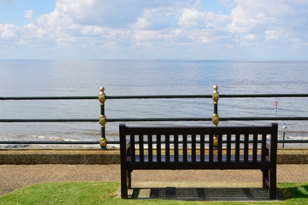 An empty bench on the promenade in Brighton, on a sunny summer's morning