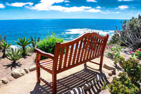 Australian beach landscape with bench in the foreground shot on a warm spring day with contrasty light