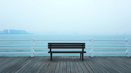 Minimalist shot of a dark wooden bench sitting on a wooden pier facing a muted ocean and hazy cityscape. Tranquil and serene view with soft, muted colors.