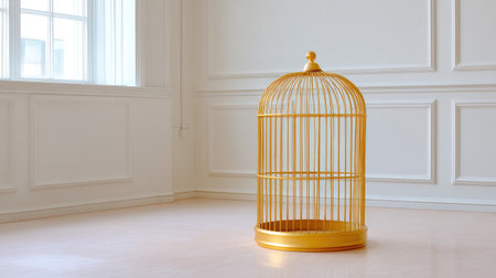 A stunning golden birdcage stands in an elegantly designed minimalist room, showcasing intricate details and casting soft shadows, evoking feelings of tranquility and solitude.