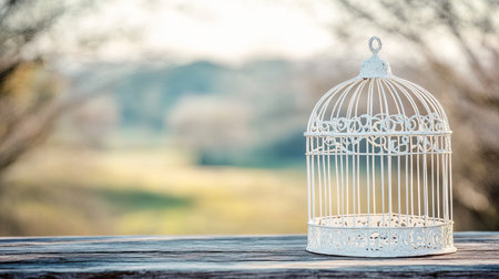 An intricately designed vintage birdcage sits elegantly on a wooden surface against a soft background. Ideal for artistic decor and minimalist themes.