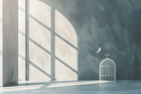 A beautifully crafted birdcage hangs against a wall, casting delicate shadows that enhance the minimalist decor. The soft light creates an inviting atmosphere.