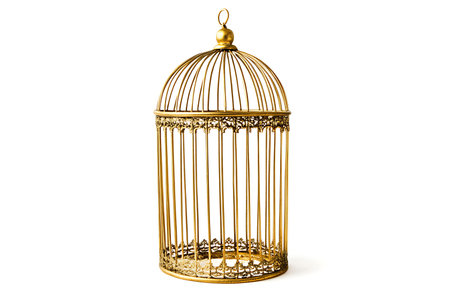 Golden birdcage on white background
