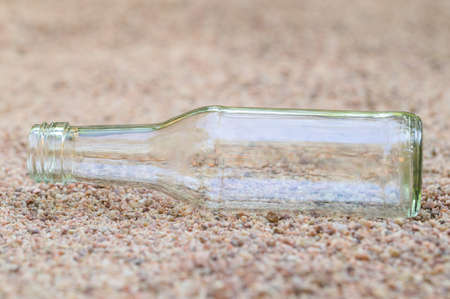Empty glass bottles on the sand Concept of garbage pollution