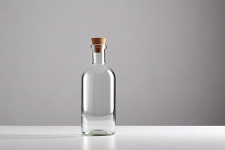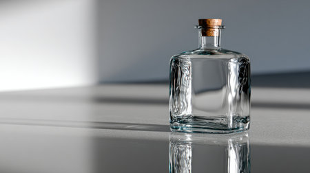 A beautifully crafted glass bottle with a cork stopper is elegantly displayed on a surface, showcasing its clarity and minimalist aesthetic, illuminated by soft natural light.