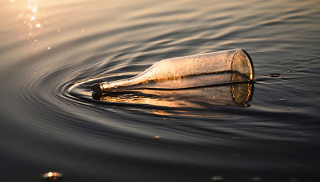 Close up view of a glass bottle on the water surface at sunset