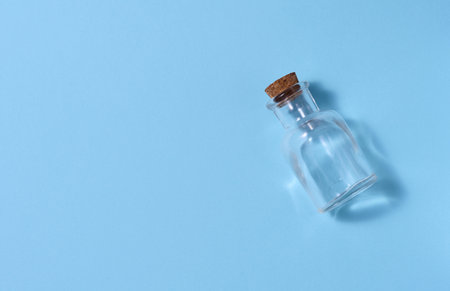 Glass bottles with cork isolated on a light blue background.