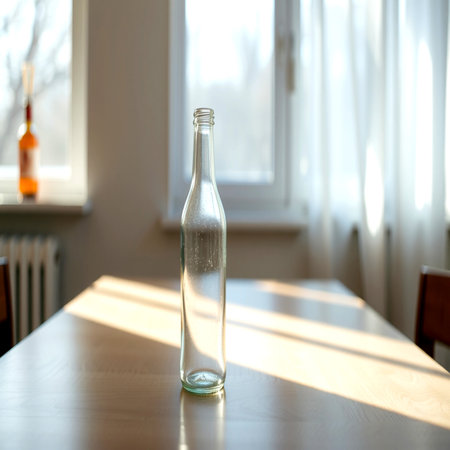 Glass bottle on the table in the morning light. Selective focus.