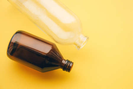 Two empty medicine glass bottle of cosmetic liquid on light background. Concept of the organic, zero waste cosmetics