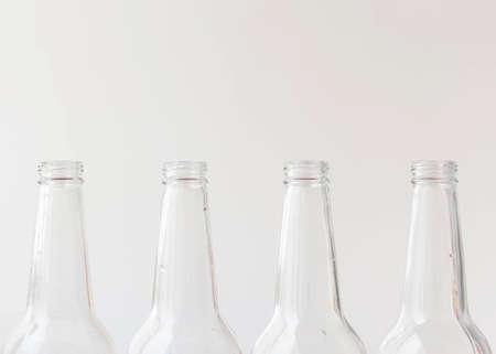 Four empty bottles on a white background, neck close-up. Glass container concept