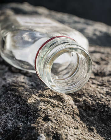 A closeup shot of an empty bottle without a lid laying on a rock