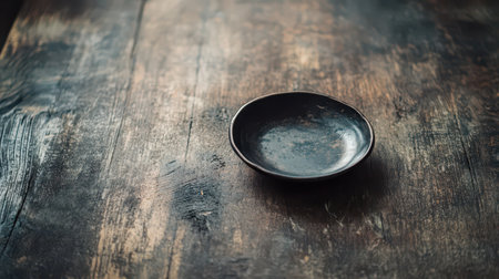 A round black plate rests on a worn wooden table showcasing the contrast of textures and colors in a simple yet striking arrangement.