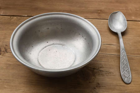 Empty aluminum bowl with spoon on the old wooden table