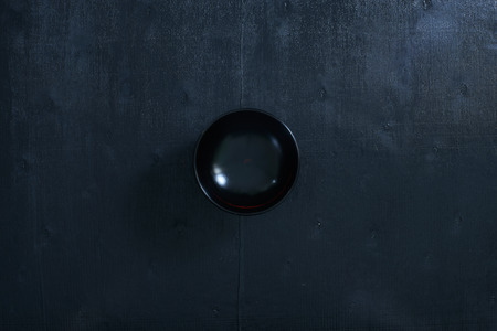 Black color wooden table top view. On the table are the Japanese wooden bowl.