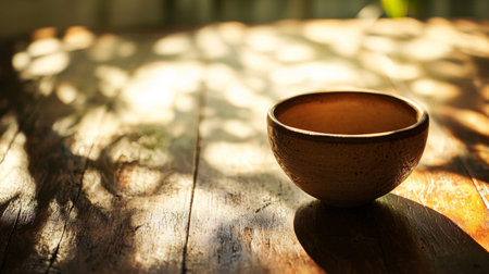 A rustic ceramic bowl casting a soft shadow on a wooden table with dappled sunlight and natural shadows, creating a warm, peaceful ambiance. Perfect for themes of simplicity, natural decor, and rustic aesthetics.