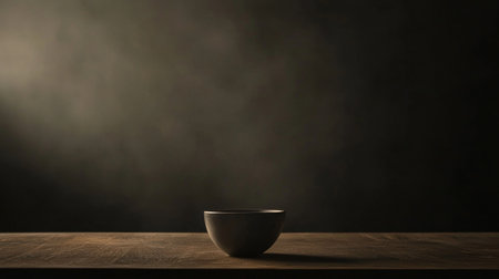 A minimalist composition featuring a black ceramic bowl styled on a textured wooden table illuminated by soft natural light.
