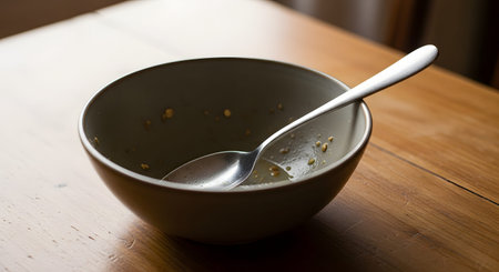 An empty, dirty ceramic bowl with a silver spoon rests on a wooden table, showing remnants of a finished meal. The image illustrates the end of dining, leftovers, or the concept of food consumption and satiety.