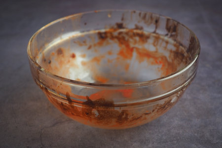 Bowl with remnants of food and stains after a meal