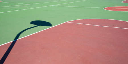 Shadow of the rack with shield and basketball ring on orange basketball rubber field ground during sunny day outdoors. Basketball game background