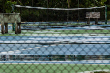 Deserted tennis court with greentrees in background in a public park on a sunny summer morning