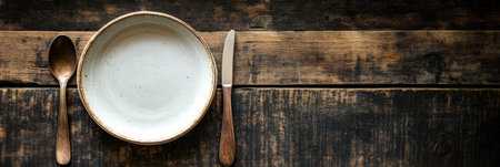An empty rustic plate sits on a wooden table with a spoon and knife on either side, inviting a meal in a cozy dining setting.