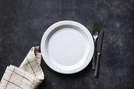Banner. An empty ceramic plate, fork, knife and towel against the background of a gray concrete table. Space for text. Menu concept for cafes and restaurants.