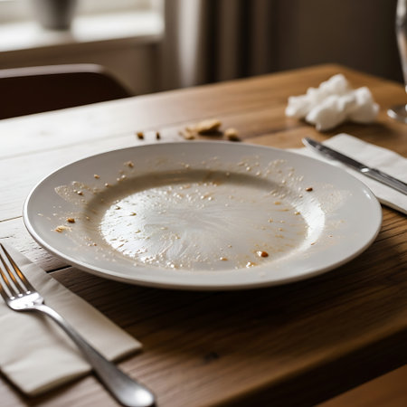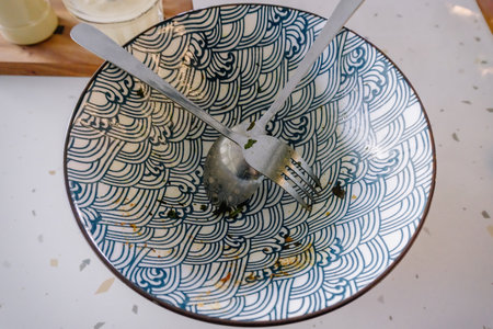 A tranquil after-meal scene: an empty bowl with a spoon and fork, beautifully lit to highlight its simple, elegant form