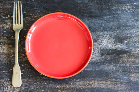 Vintage porcelain plate and vintage fork on rustic wooden table