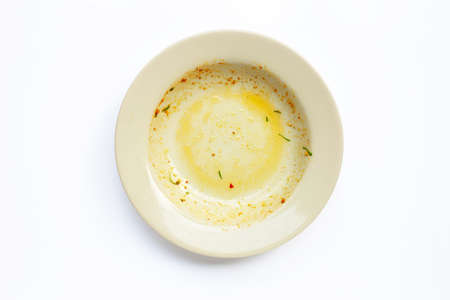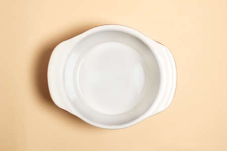 Top view of empty ceramic soup bowl isolated on beige background. empty ceramic pan. Flat lay of utensils for cooking