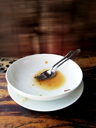 Dirty plate with spoon and fork on wooden table in coffee shop