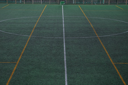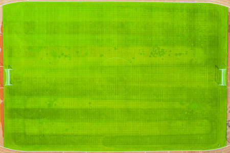 Soccer Ground Detail. Outdoor sport ground with green surface for playing football or soccer in urban area, detail, drone view