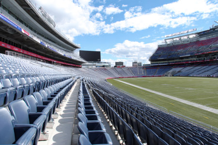 A clean, empty stadium with rows of seats stretching out towards the field, the bright blue sky creating a peaceful atmosphere