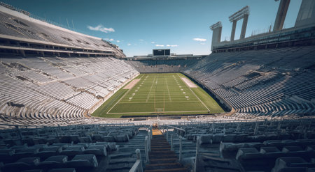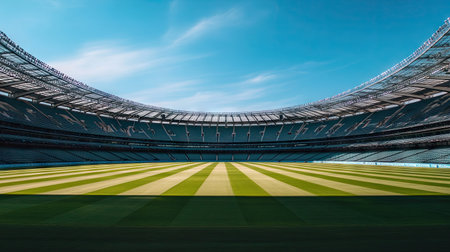An expansive view showcases an empty stadium with tiered seating and a pristine green field. The architectural design features symmetrical arrangements, with the open sky above. This image, with its composition and natural lighting, is suitable for commercial and editorial purposes, highlighting sports or event venues.