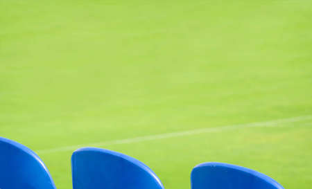Seating of a grandstand behind a coach bench in a soccer stadium.