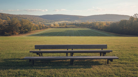 A picturesque sports field featuring empty wooden benches, surrounded by lush greenery and a misty forest. Ideal for sports events or tranquil nature scenes.