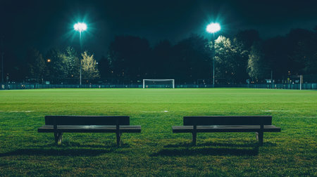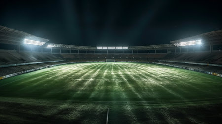 Captivating view of an empty football stadium at night, featuring vibrant lights illuminating the lush green field and the modern surrounding architecture for upcoming events.