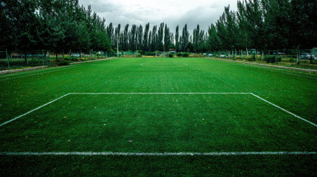 A serene soccer field featuring vibrant grass and surrounded by tall trees under an overcast sky, ideal for sports enthusiasts and outdoor relaxation.