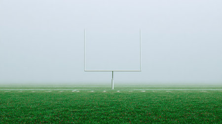 An empty football field shrouded in thick fog creates a serene atmosphere. The goal post stands prominently against the mist, capturing the essence of sports anticipation.