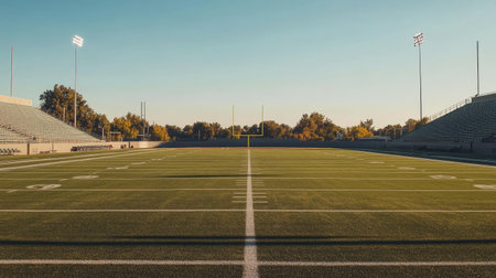 An eye-level perspective showcases an american football field, focusing on its green turf and white yard lines. The composition employs leading lines, leading to the distant horizon. The scene is bathed in warm sunlight. The image could be suitable for sports related projects or general visual content.