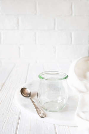 Glass transparent jar on a white table background. Copy, empty space for text.