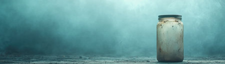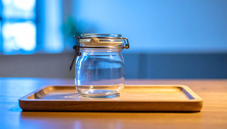 A transparent glass jar sits on a flat surface against a soft blue backdrop illuminated by gentle sunlight creating a serene ambiance.