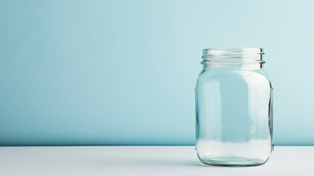A clear glass jar sits empty against a soft blue background, highlighting its simplicity and versatility for storage or decoration in any setting.