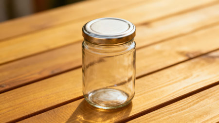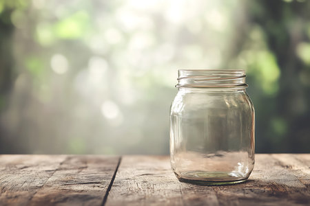 Clear glass jar on wooden table with green bokeh background, sunny outdoor setting. Simplicity and nature concept
