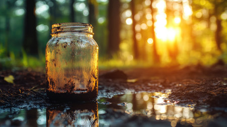 A close-up of a muddy glass jar placed near a small puddle, reflecting the surrounding trees and soft sunlight in a peaceful forest, evoking tranquility and nature balance